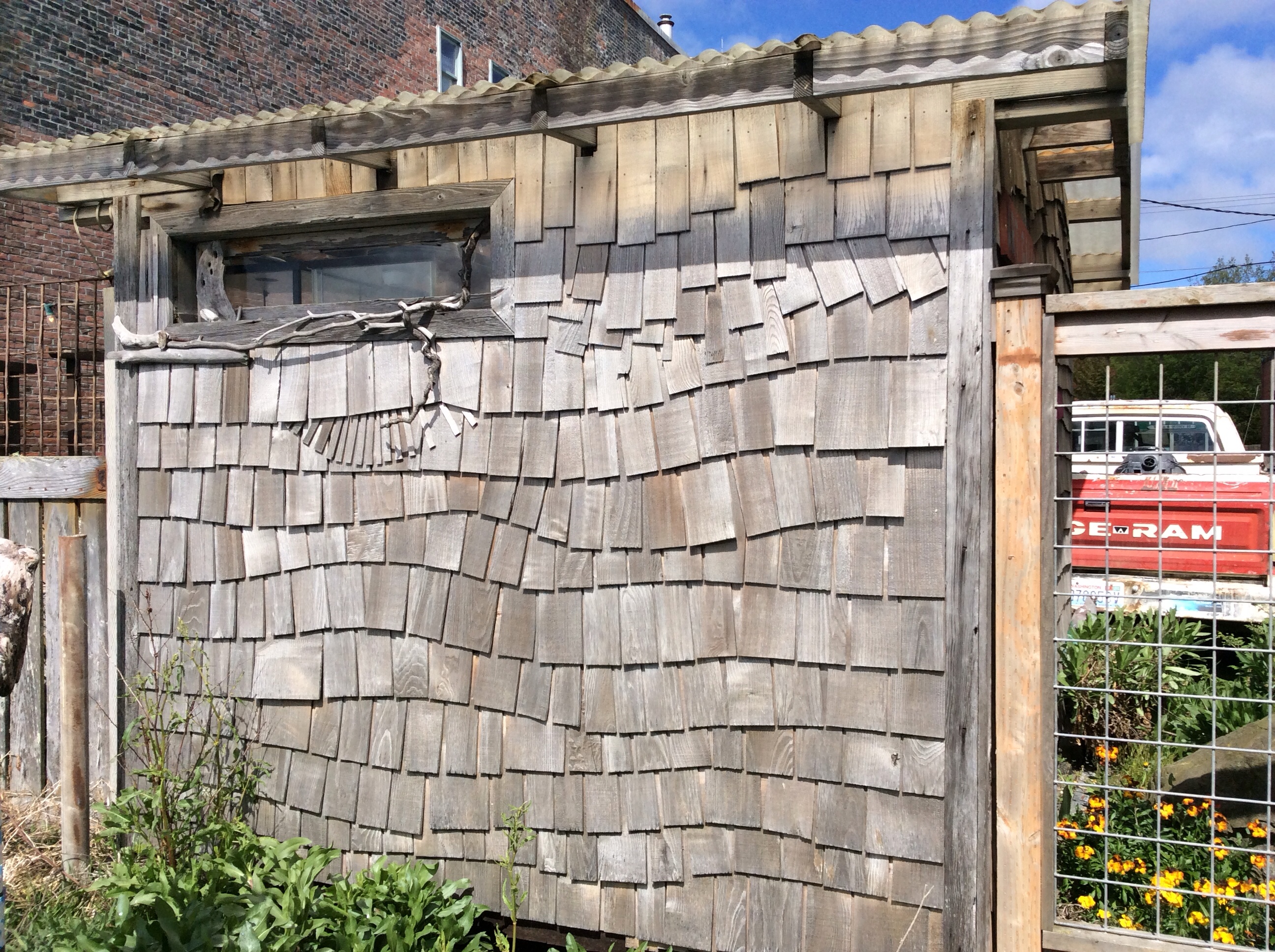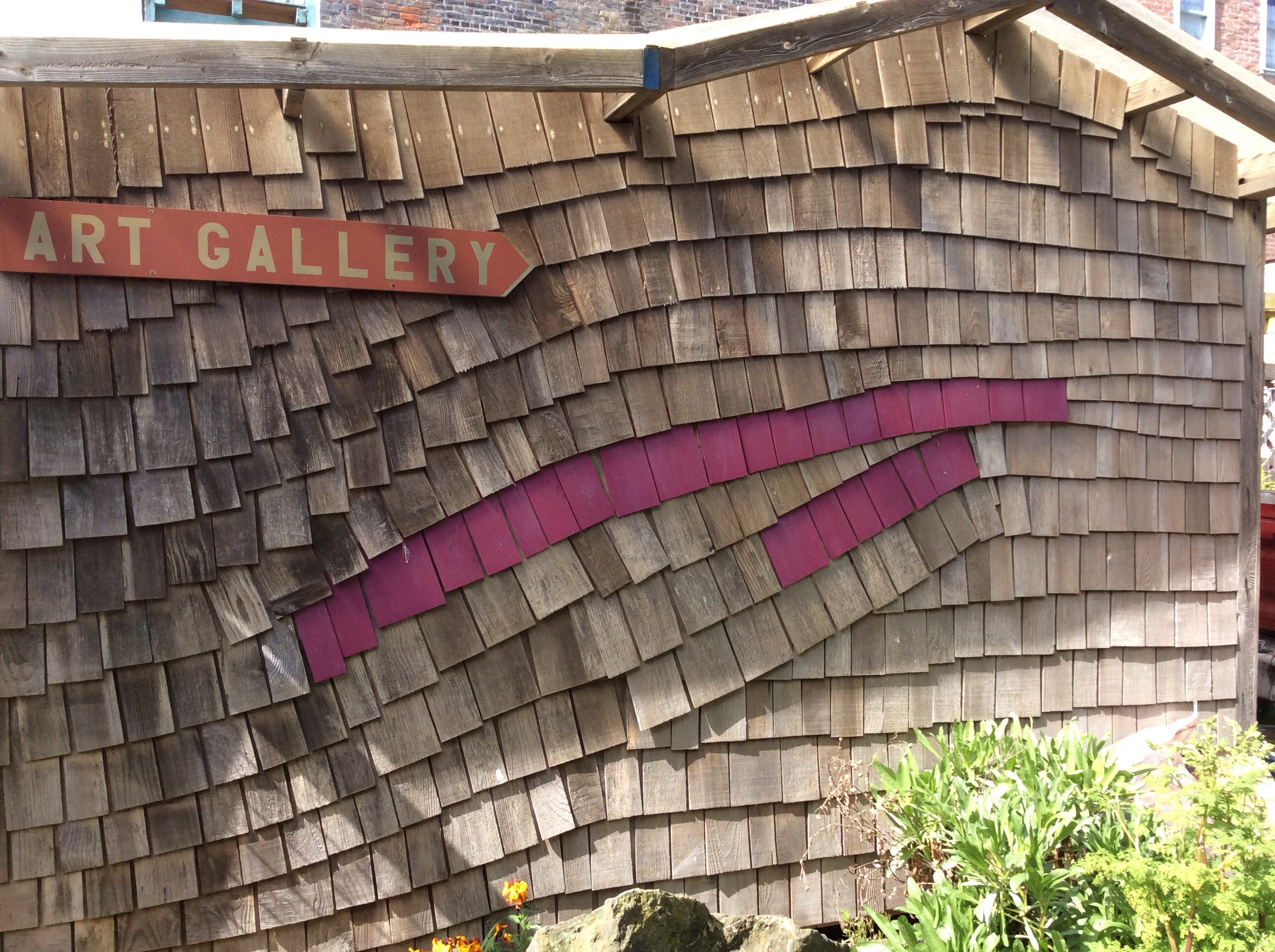 The coffee shop was attached to a store that carried a variety of items that make sense to sailors. There were bins of brass hardware, books, foul weather clothing, cards and gift items and hanging from the ceiling were two very beautiful wooden kayaks with labels that explained they had been made as a community project. The wooden ship connection to Port Townsend suggests that wood artisans may gravitate to the town. I noticed this tiny shed of a gallery that flowed it’s wood creativity right out onto it’s shingles: