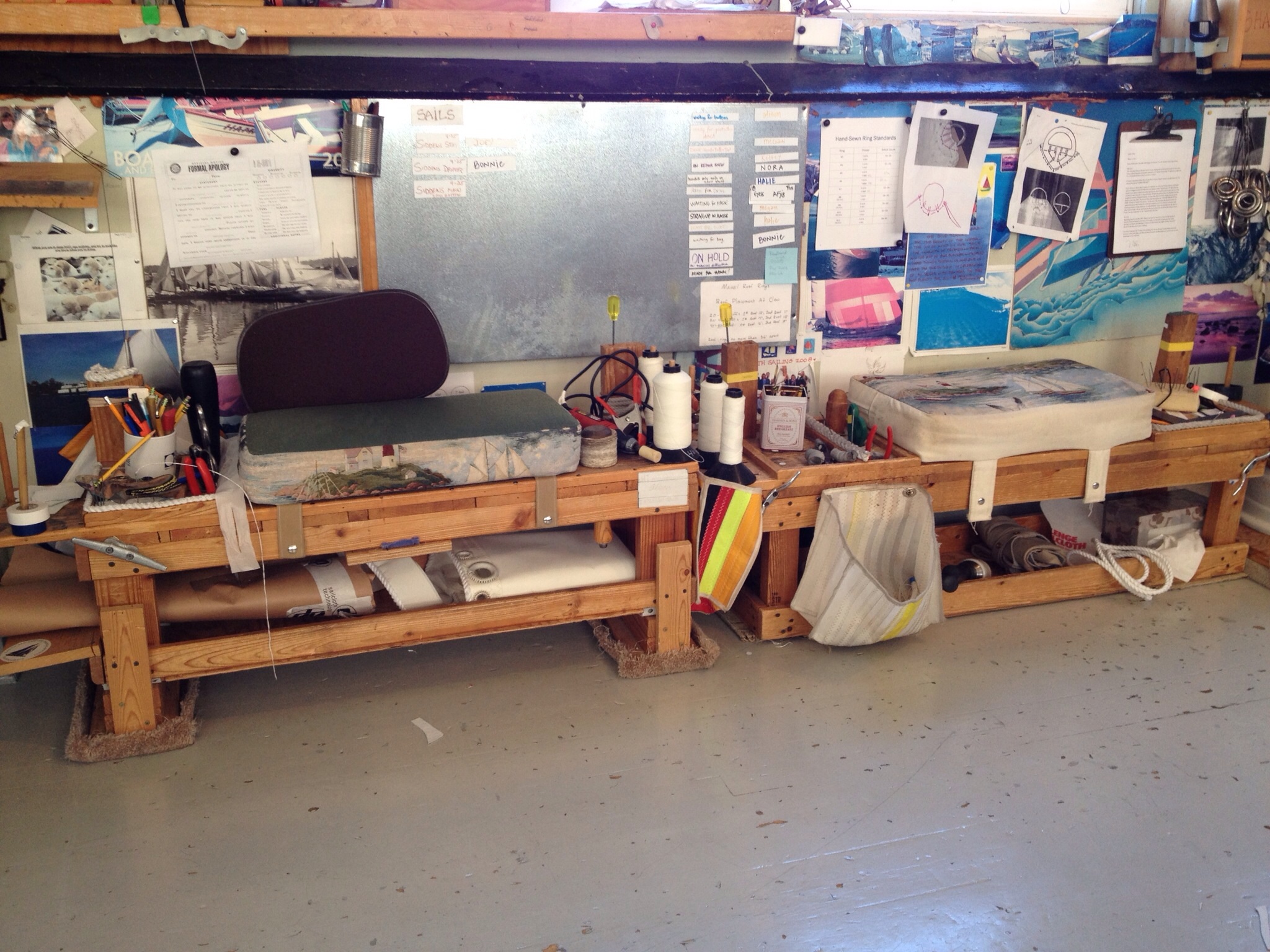 Each sail maker has a designated stool for their work. Bonnie said sail making is quite physically taxing so anything that can help to provide leverage, protection, or just ease the process is welcomed. However, it seems no one has figured out how to overcome the crouched, bent-over position one assumes for much of the day.