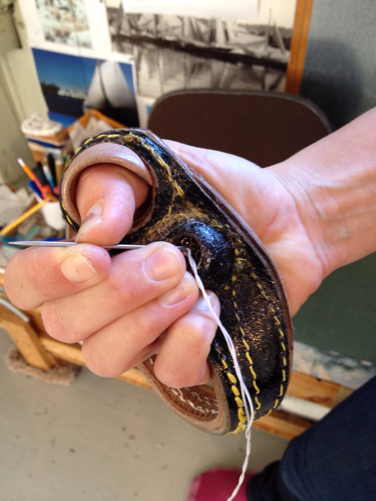The sail maker’s palm is a leather strap that fits the hand like brass knuckles. In the center of the palm is a metal disc sewn into the leather strap which provides protection and a hard surface with which to help force the needle through the fabric. Anyone who has tried sewing leather or multiple layers of fabric with an inappropriate needle will recognize the value of this tool!