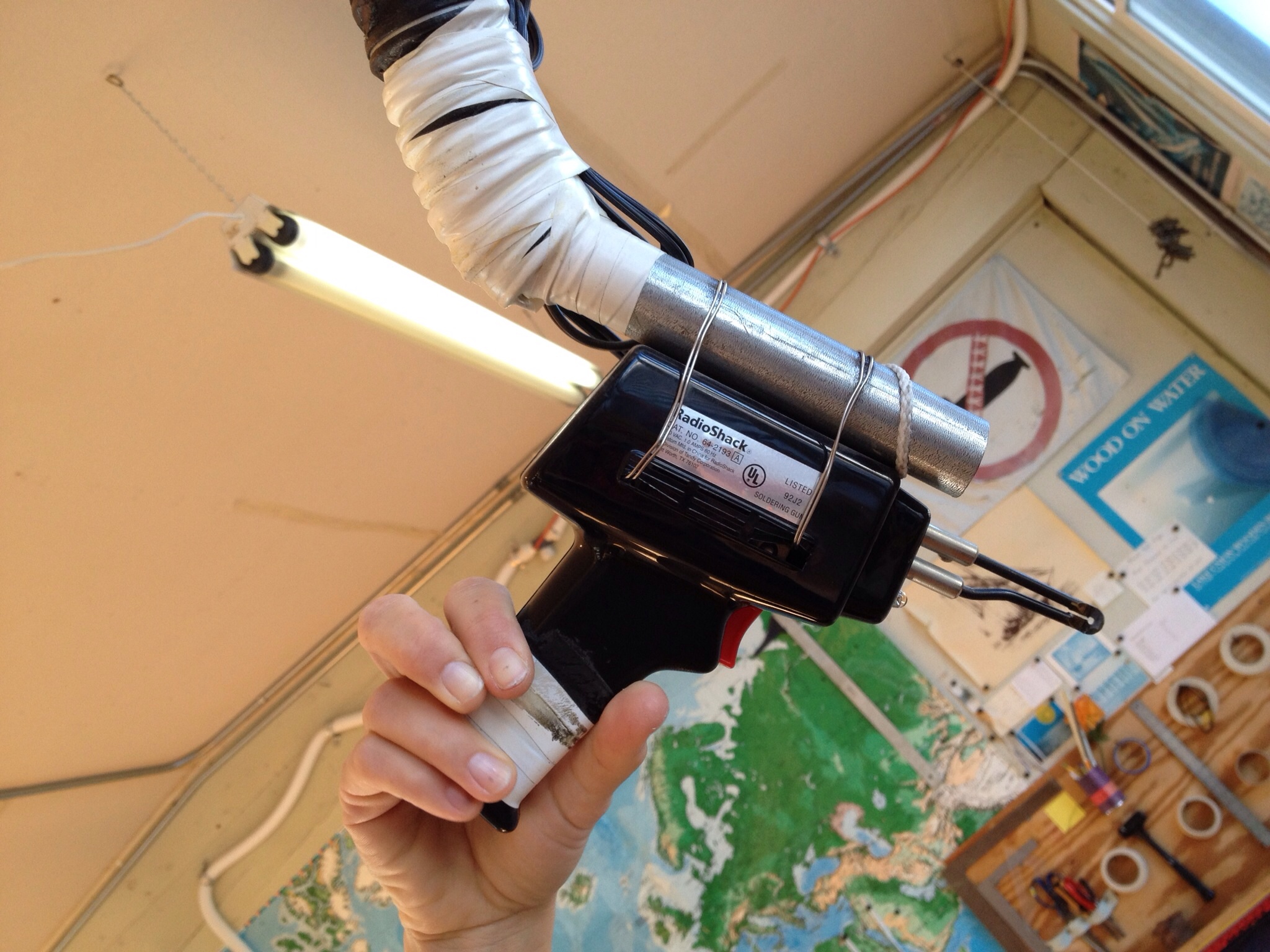 This unusual tool which looks like a soldering iron connected to a vacuum hose had copies of itself hung throughout the sail loft. The vacuum was a centralized system so all the “guns” were attached to hoses strung about the ceiling and they dangled down within easy reach.