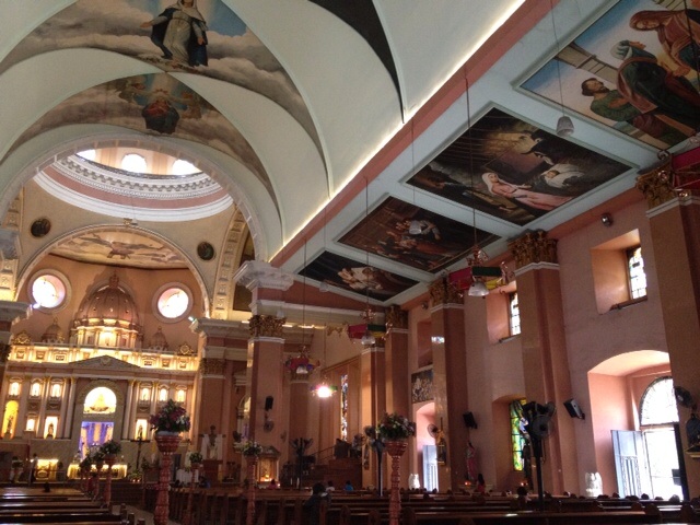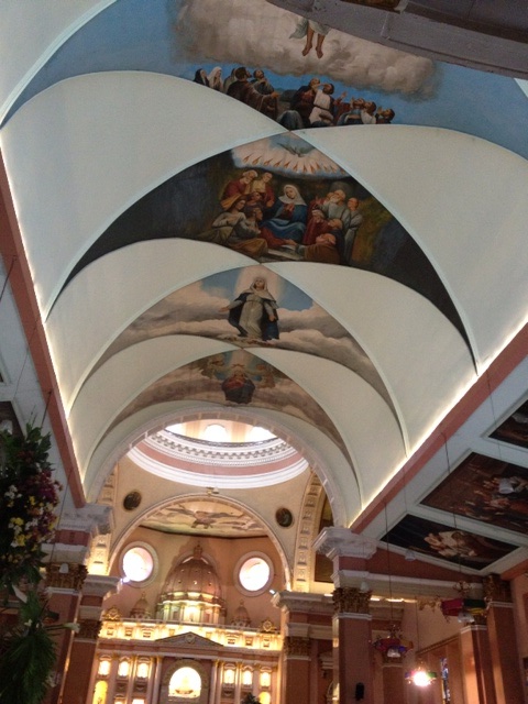Manila’s skyline from a hotel rooftop in Intramuros. The channel you see running from the lower left at a diagonal toward upper right is the wall. You can walk on portions of it.Manila is packed with Jeepneys! They are open air buses that are inexpensive to ride. They are also the most colorful, expressive things I saw in Manila.Here’s a colorful one, Jesus on the side.Another jeepney passing in front of a church. You’ll note religious sayings on all the jeepneys. This one isn’t as colorful as some but these shiny silver ones were common too.This church, Minor Basilica of St. Lorenzo Ruiz, was striking with its dark color, red trim and shiny, shiny gold statues. The ceiling inside was quite unusual as well. (next photo)