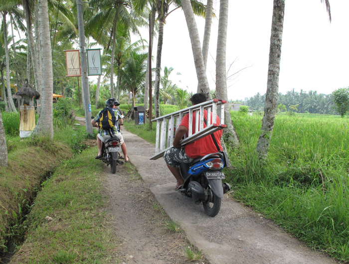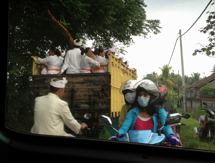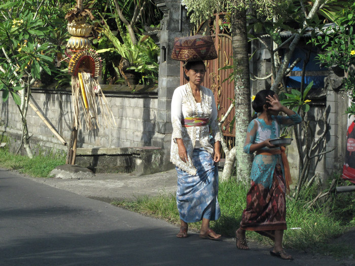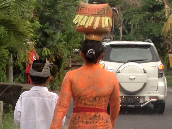 The women here carry things on their heads and they’re extremely skilled at it. I’ve seen the most lopsided things perched on heads that somehow are carried hands-free. These photos show women carrying offerings for ceremonies. The first and third photos are examples of offering boxes which are sold in all kinds of markets here.