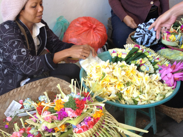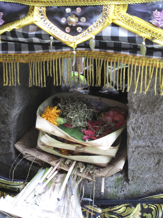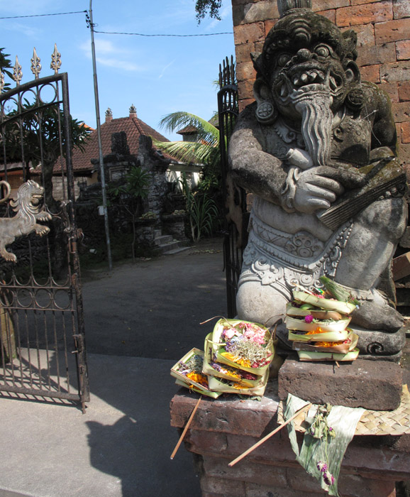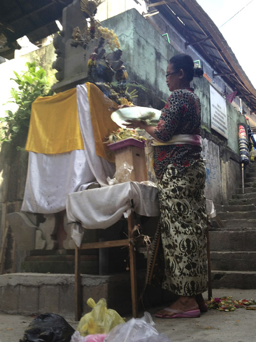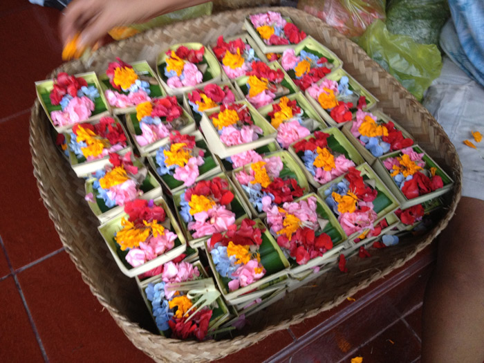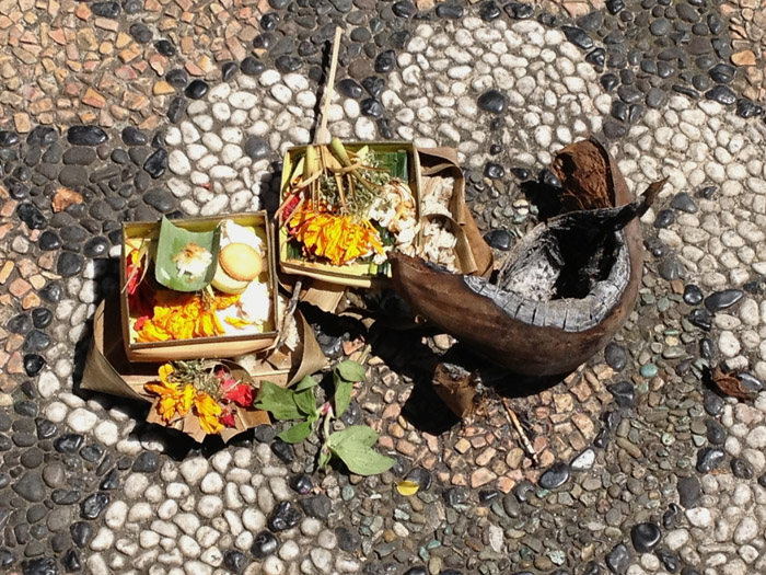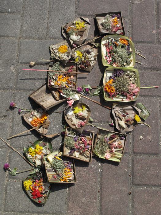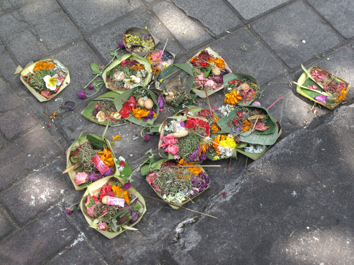 These can be found all up and down the street in front of houses, on the sidewalks in front of businesses, and anywhere someone felt it was appropriate to place an offering. Given the narrow sidewalks and their location underfoot, it is quite common to see where someone has accidentally stepped on one (or several). As one balinese woman said