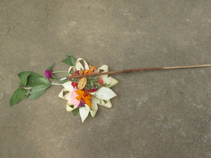 To create the offerings, coconut leaves are fashioned into boxes or flower-shaped containers. I’ve seen some people use staples, and others use small toothpick pieces to hold the edges together. The boxes then hold bits of various things… petals, grass, perhaps whole flowers, and sometimes I’ve seen dollops of rice and even small baggies of what looks like coffee (as a liquid, not as grounds) placed on top. Leaves may be spliced and twirled into various shapes to decorate the finished piece.